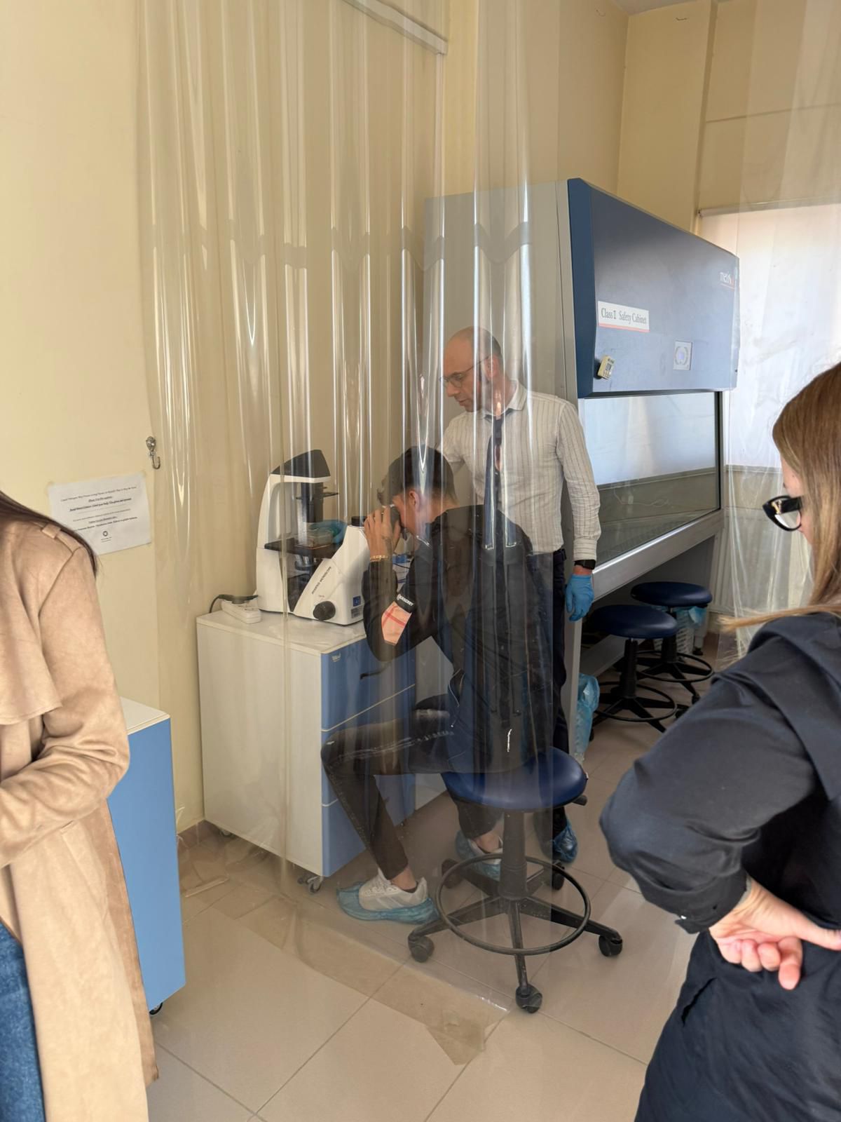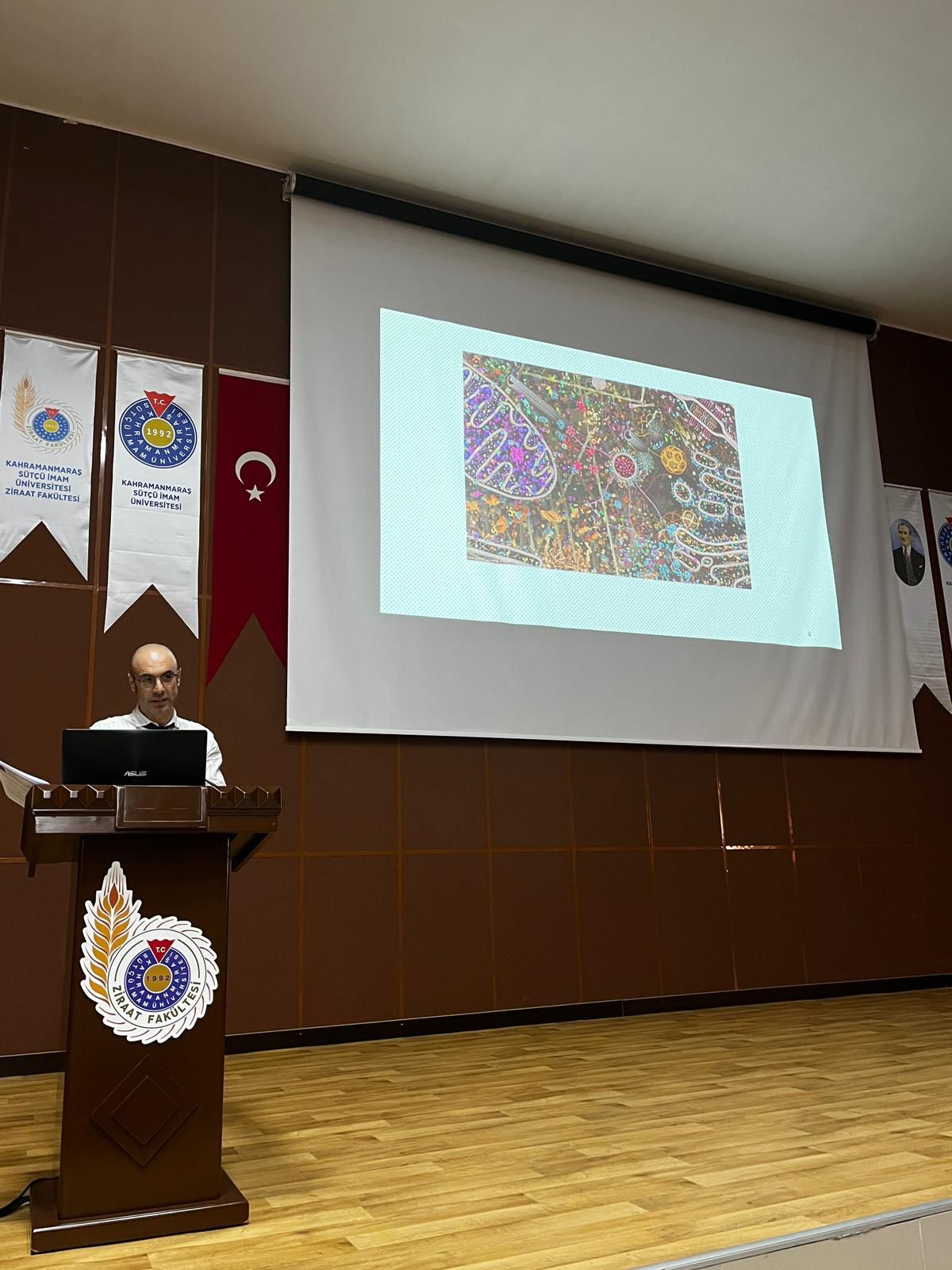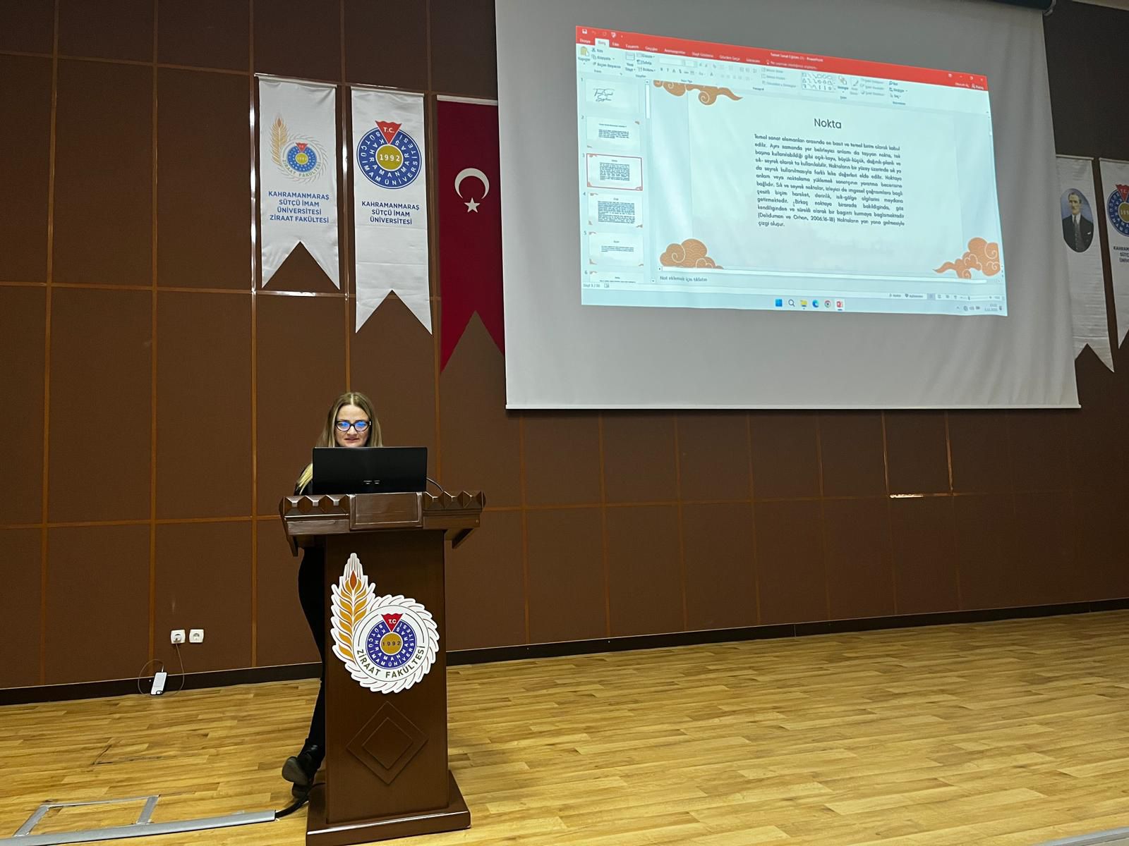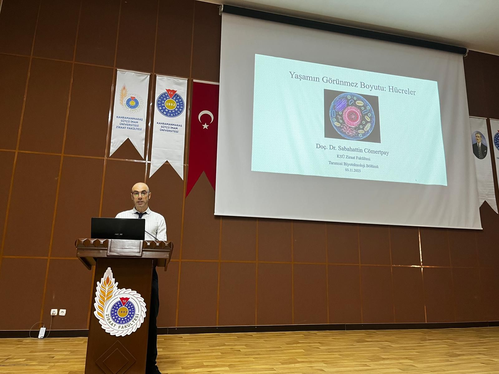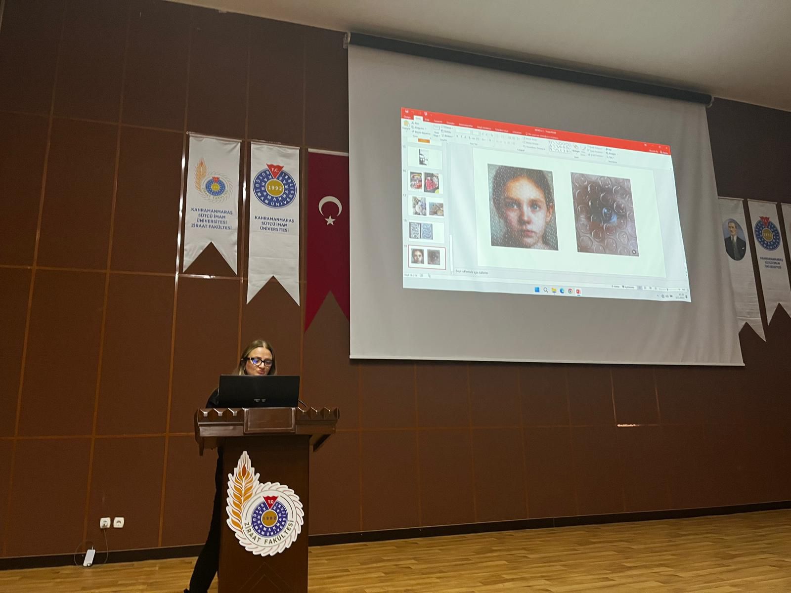 “Temel Sanat Eğitimi” dersi kapsamında KSÜ Ziraat Fakültesi Tarımsal Biyoteknoloji Bölümüne bir ziyarette bulundular. Gerçekleştirilen gezi sayesin de öğrenciler sanatın elemanlarından “Nokta” konusunu Hücre Kültürü labaratuvarında mikroskop altında hücreleri inceleyerek öğrenme fırsatı buldular. Ziyarette Ziraat Fakültesi Öğretim Üyesi Sayın Doç. Dr. Sabahattin Cömertpay “Yaşamın Görünmez Boyutu: Hücreler” konulu bir sunum gerçekleştirdi. Ayrıca Ders Yöneticisi Dr.Öğretim Üyesi Yeşim Ermiş “Yaşam Alanımız da Nokta, Hücre Sanatı ve Metamorfoz” konulu sunumunu yaptı. Sunumların ardından öğrenciler laboratuvarda hücrelerle ilgili incelemeler yaptı.